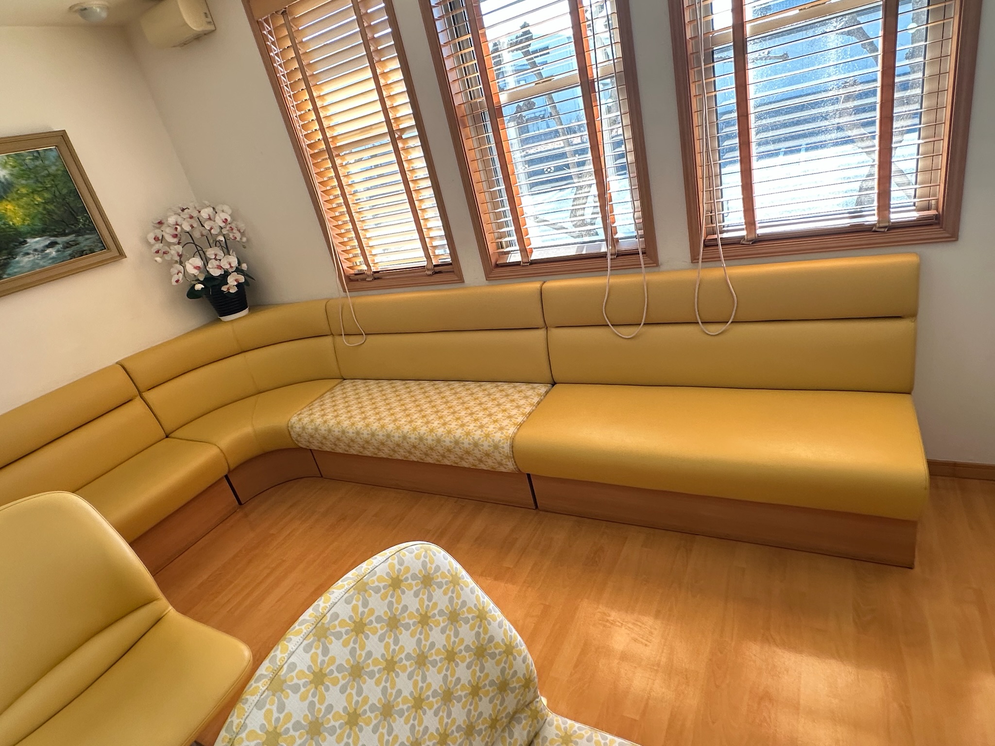 病院の待合ソファの張替えを行いました。アイランドタイプと壁面ソファタイプのそれぞれに破れのある座面がありました。座面の交換のみで、こちらもアクセントに柄の入った生地で張替えを行いました。待合ロビ...