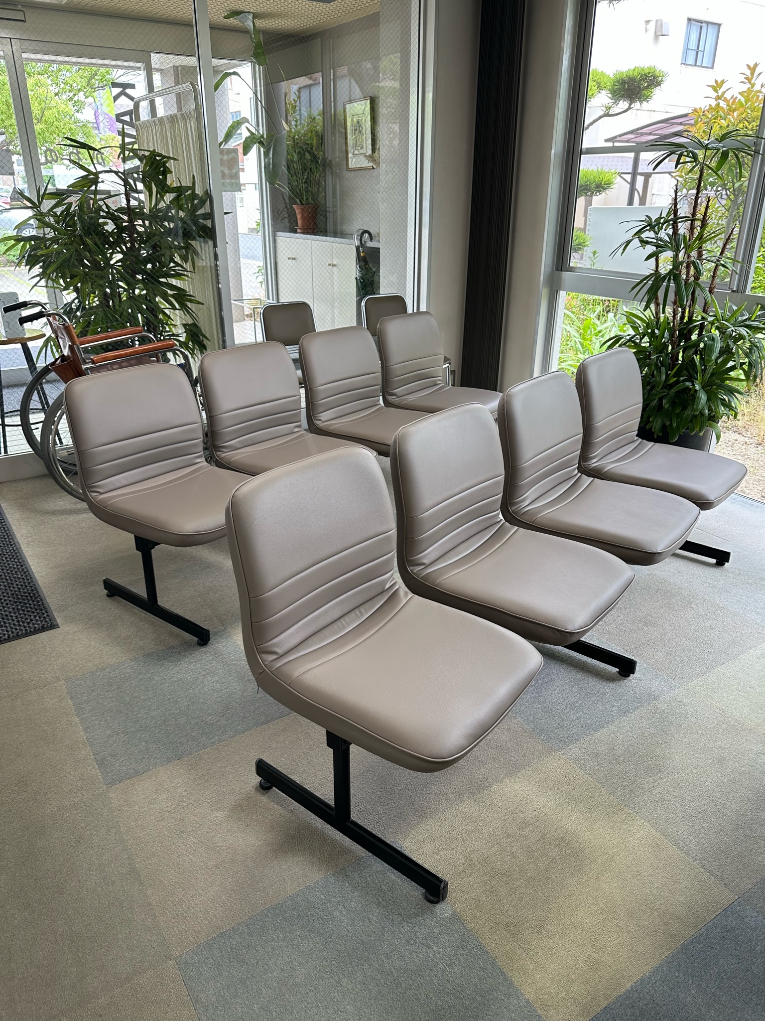 病院の待合室の椅子の張替えを行いました。 3人掛け、4人掛けのものも張替え可能です♪ クッション材(ウレタン等)も必要に応じて交換可能です♪ お気軽にご相談ください(^^)/