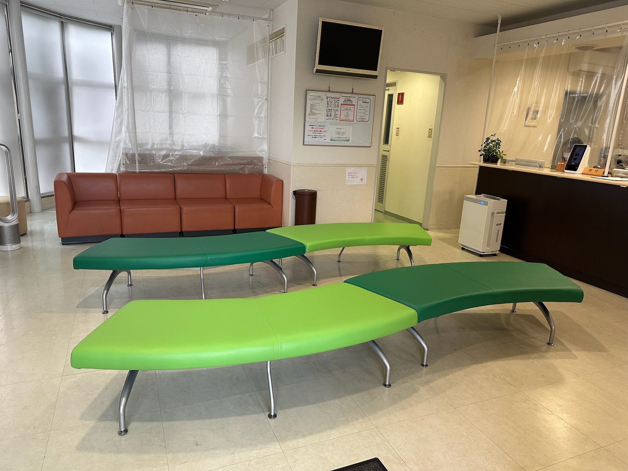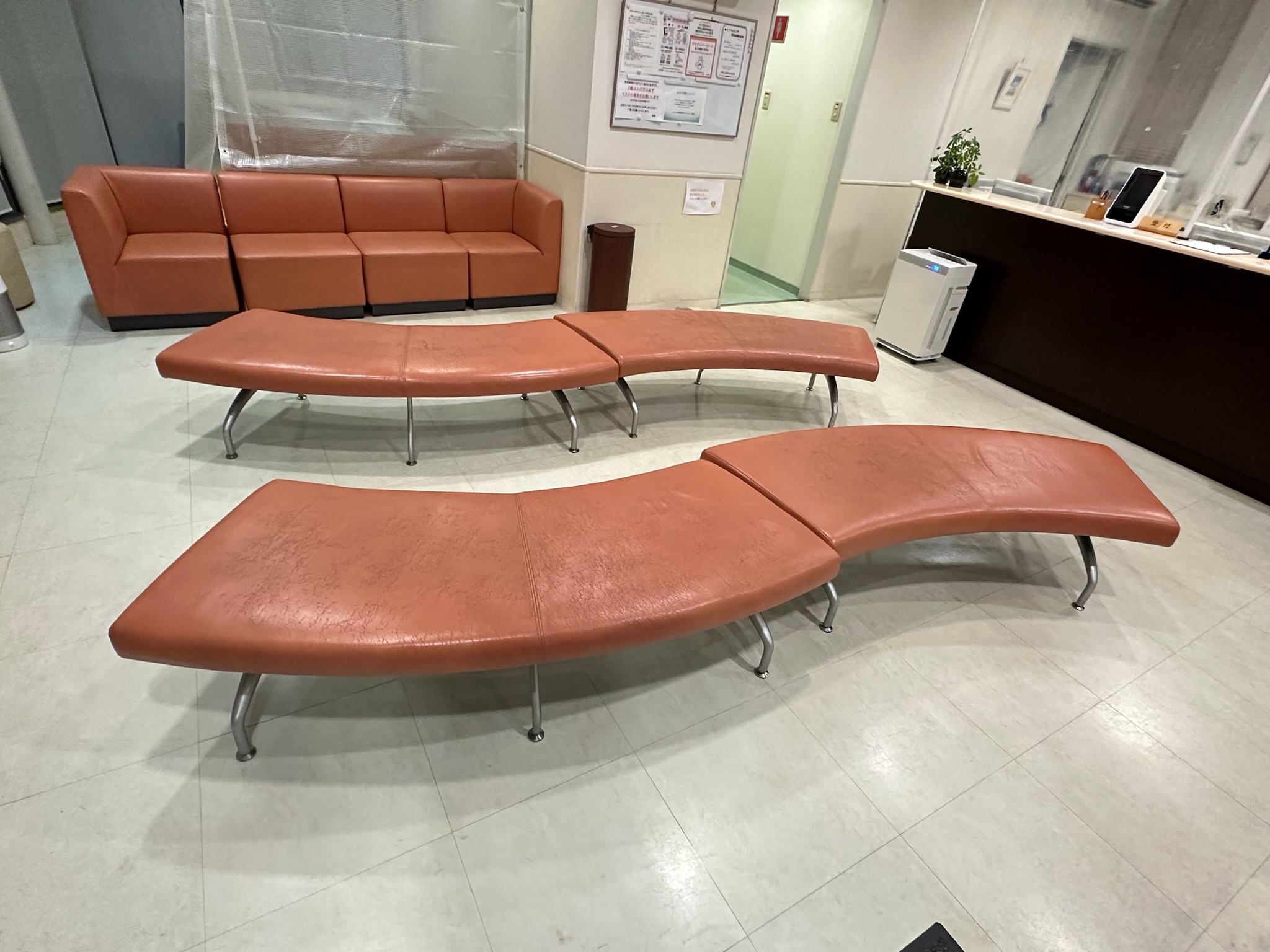 病院の待合ベンチの張替え依頼をいただきました。生地の劣化によるひび割れがあり、生地の張替えをいたしました。張替えをキッカケに生地のカラーもチェンジ。明るい印象の待合になりました♪ 待合い椅子は...