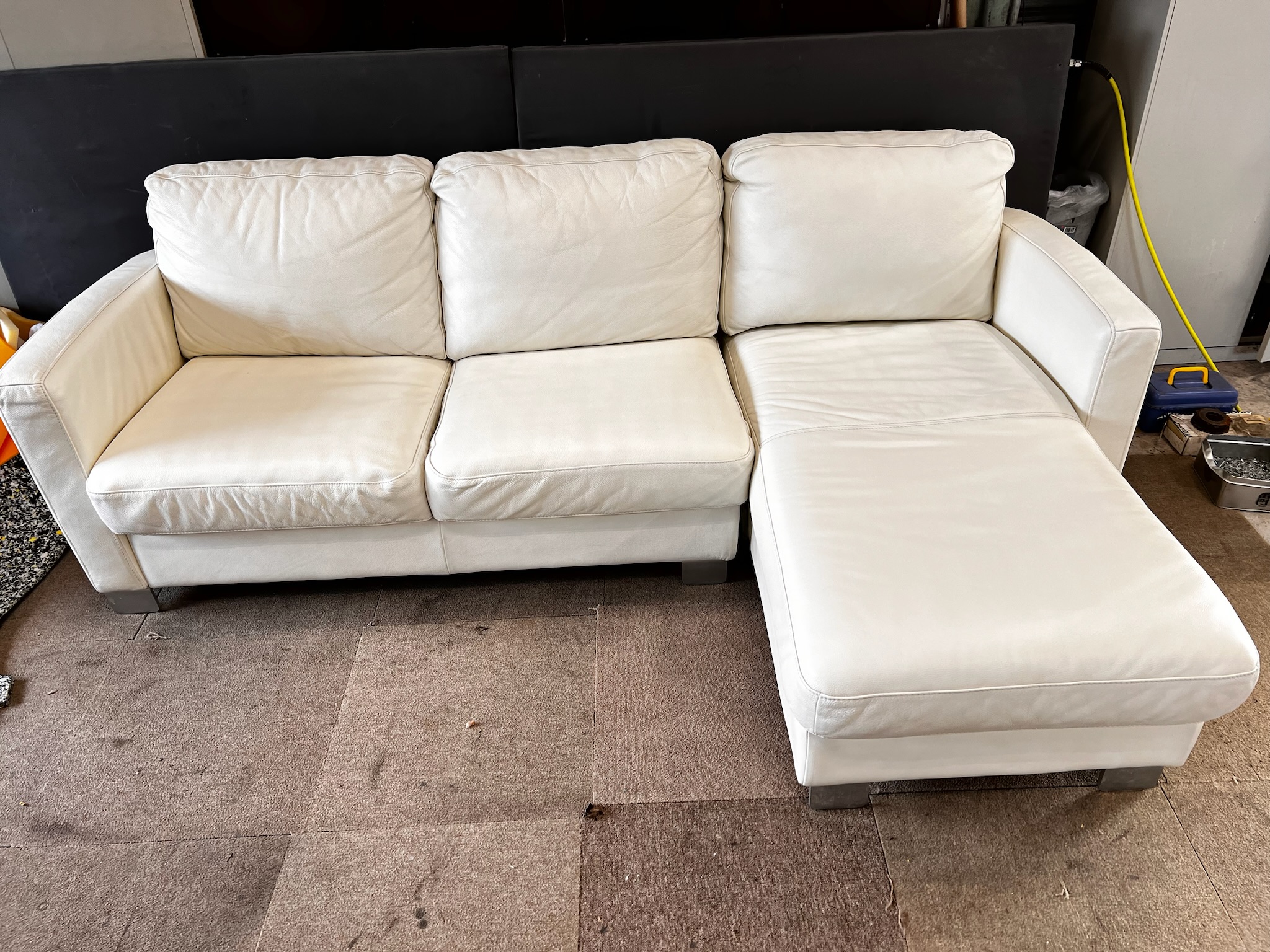 本革カウチソファの張替え依頼をいただきました。二人掛け部分の座面張替をおこない、全体的に塗装でキズのリペアを行っております。傷の深くない部分は、塗り直しのリペアでもキレイに蘇ります!傷の深い場合...
