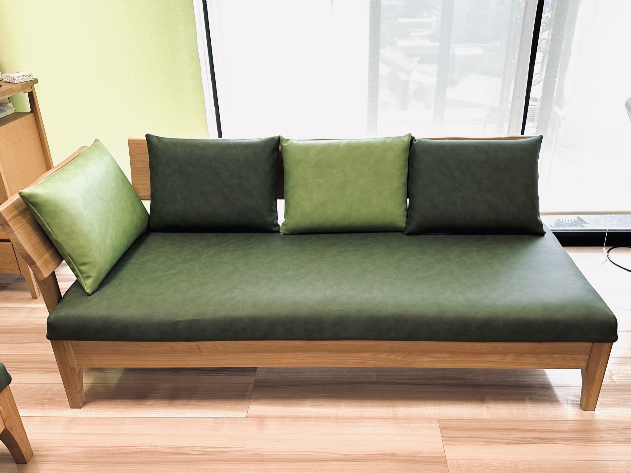 カバータイプのソファの生地交換を行いました。 クッションもソファも、布⇒合皮に☆ カバーのみを取り外しができましたので、製作後現地交換いたしました。 合皮になることでお手入れがしやすいです♪