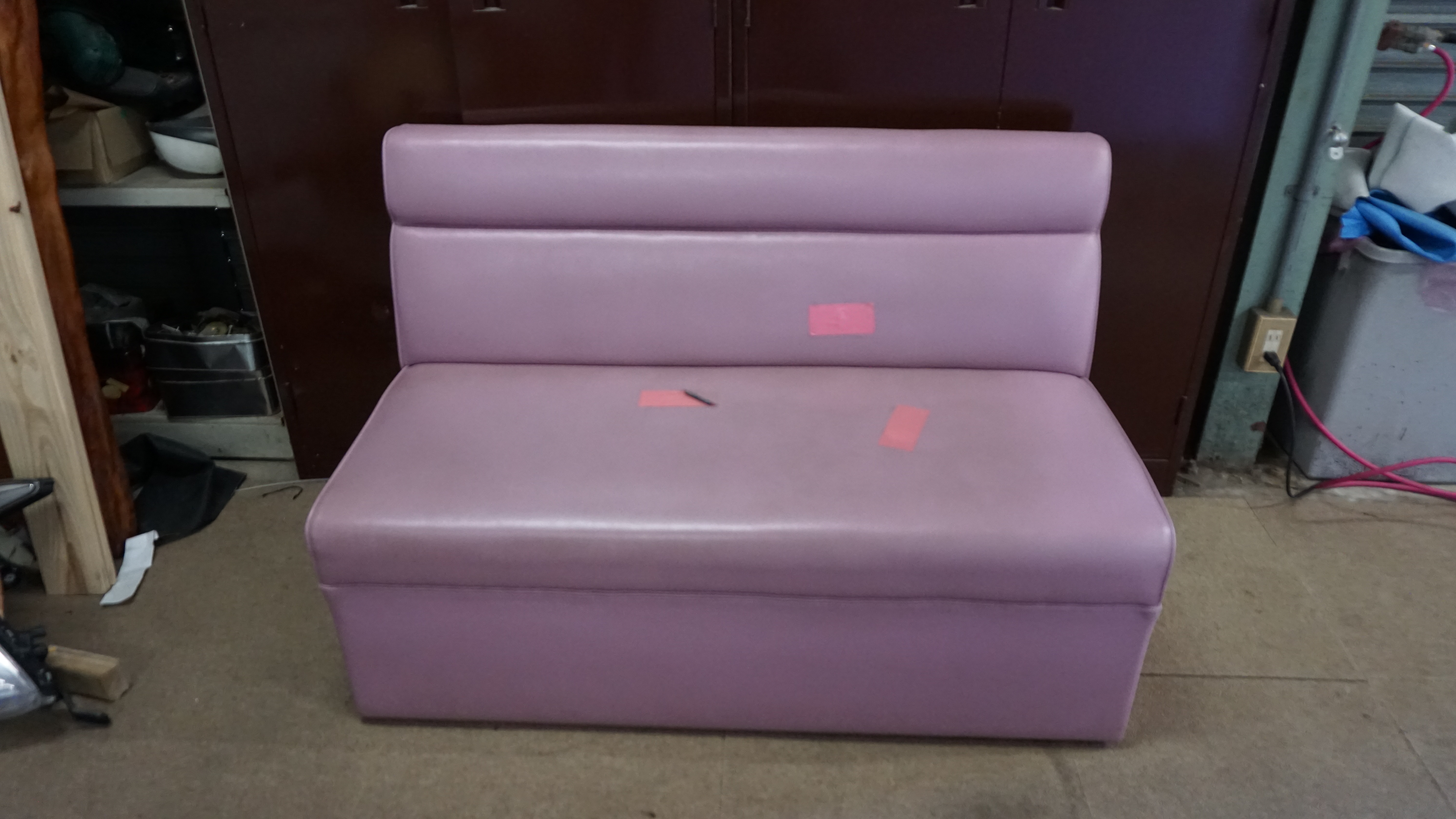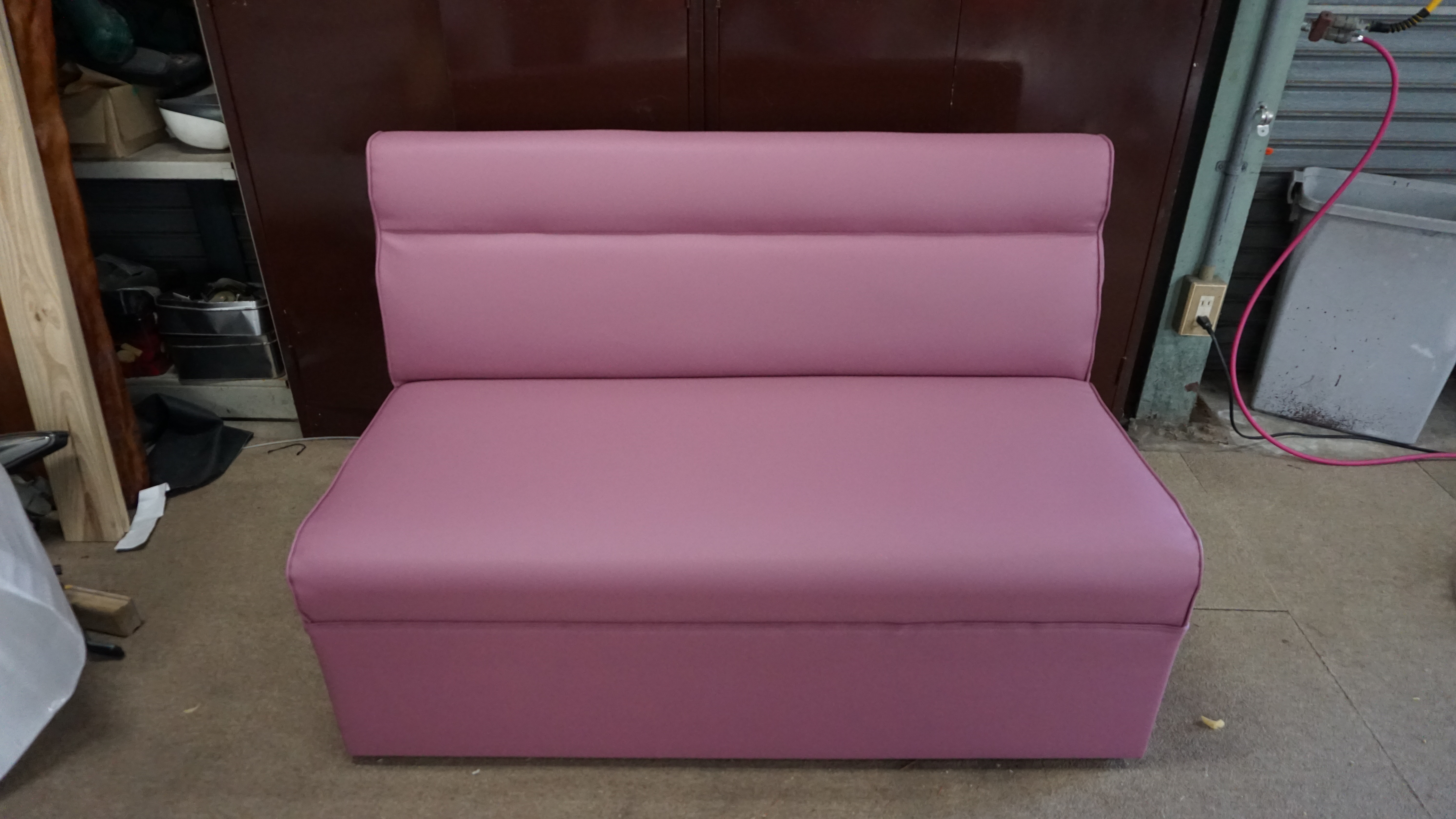 高齢者施設内のカラオケルームの椅子の張替えを行いました。飲食店やスナックなどに多いボックスタイプのソファです。ファブリック素材から合皮に変更。合皮は、汚れなどを水拭きできたりと、手入れがしやすい...