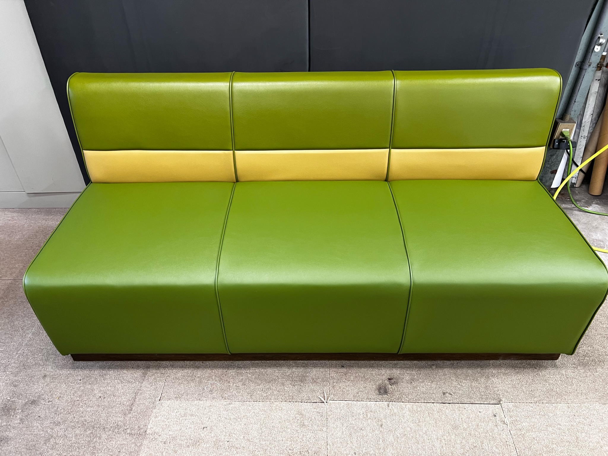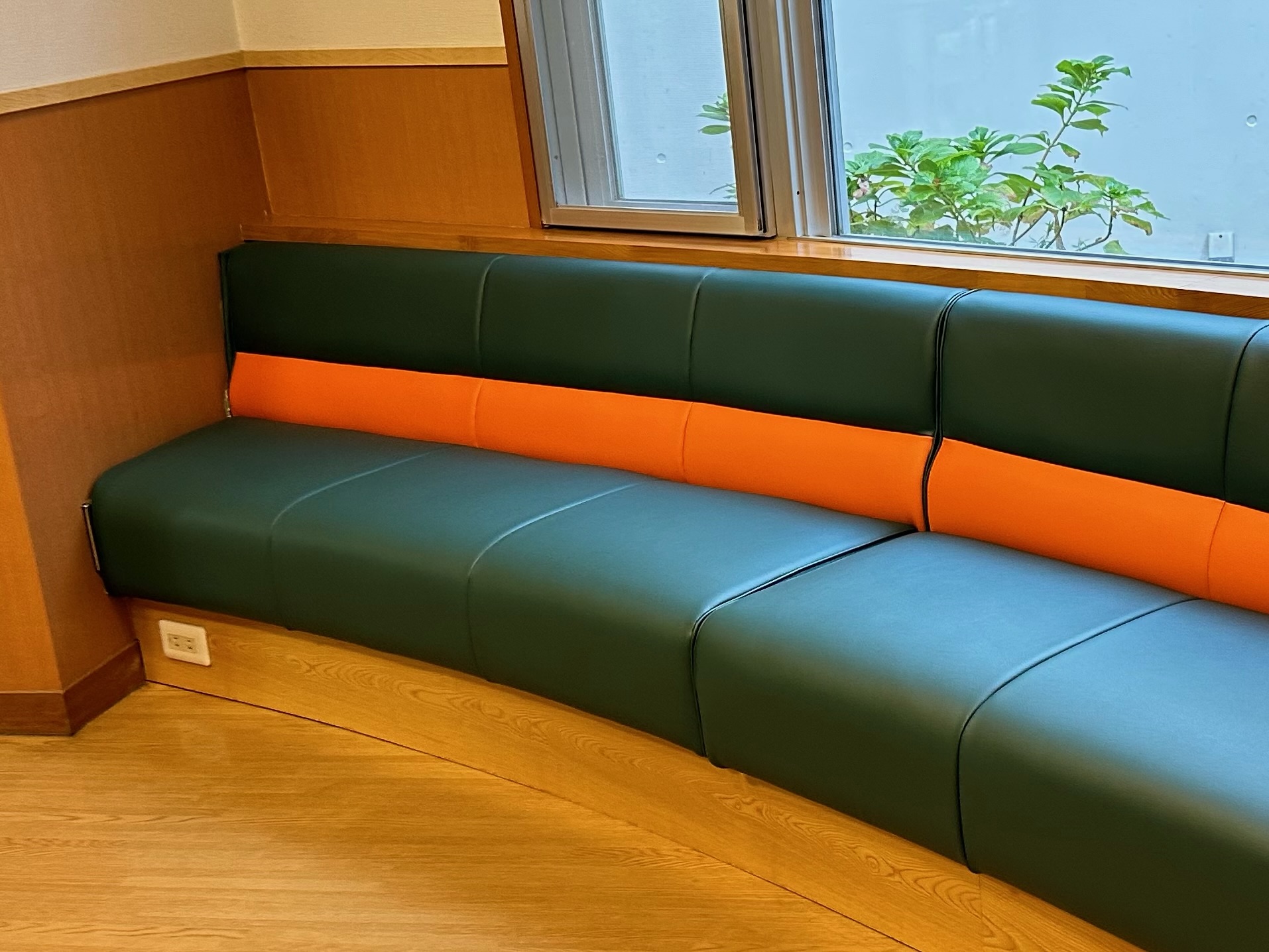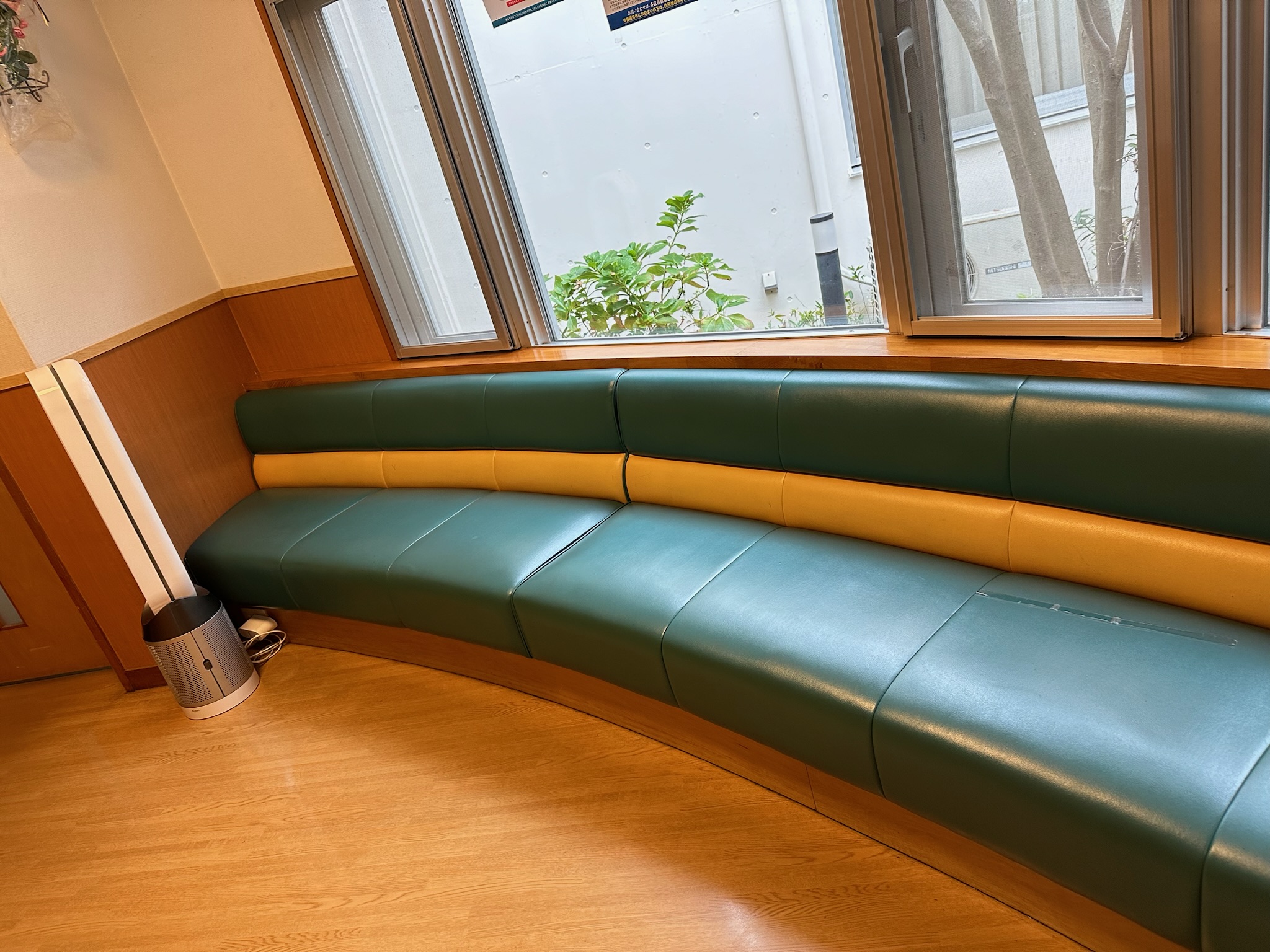 病院の待合ロビーにあるボックスソファの張替えを行いました。 開業からの作り付けの家具でしたので、日焼けや破れ等の劣化のため、背も座も張替えを行っています。