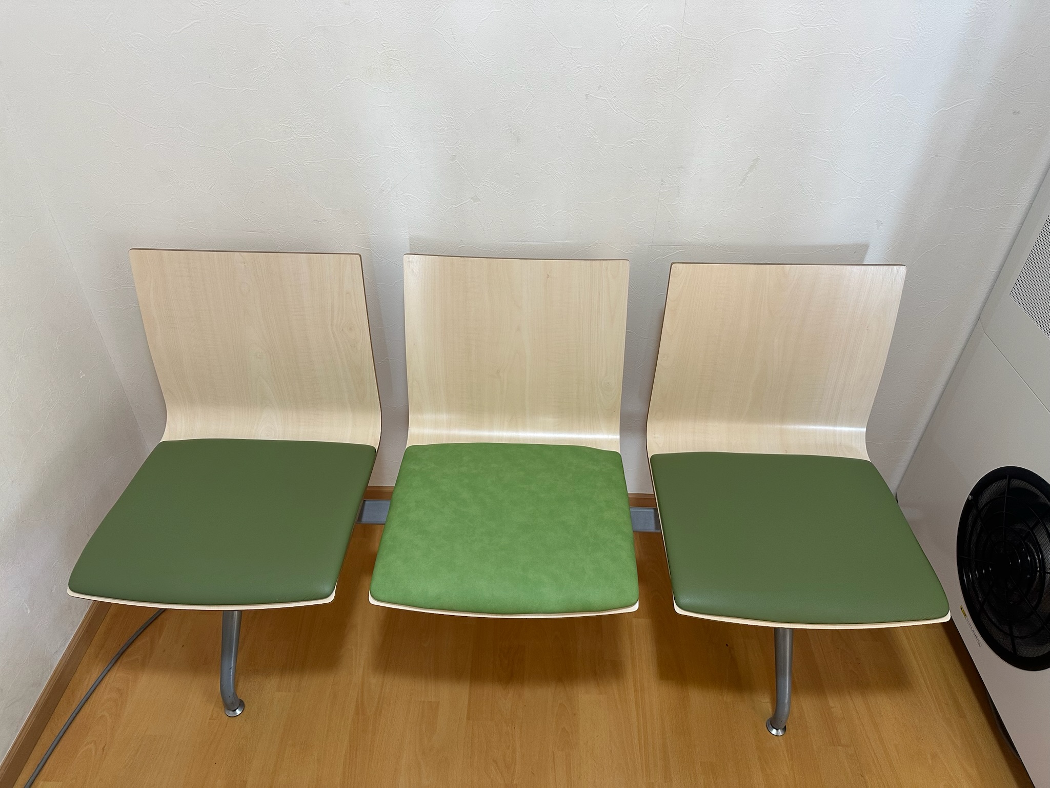 病院の待合に使用されている3人掛けの椅子の張替えを行いました。今回は3人掛けの椅子の一席分の座面の張替えを行いました。破れのあった分は黒のテープのある左の席ですが、生地を変えたために、座席の組み...