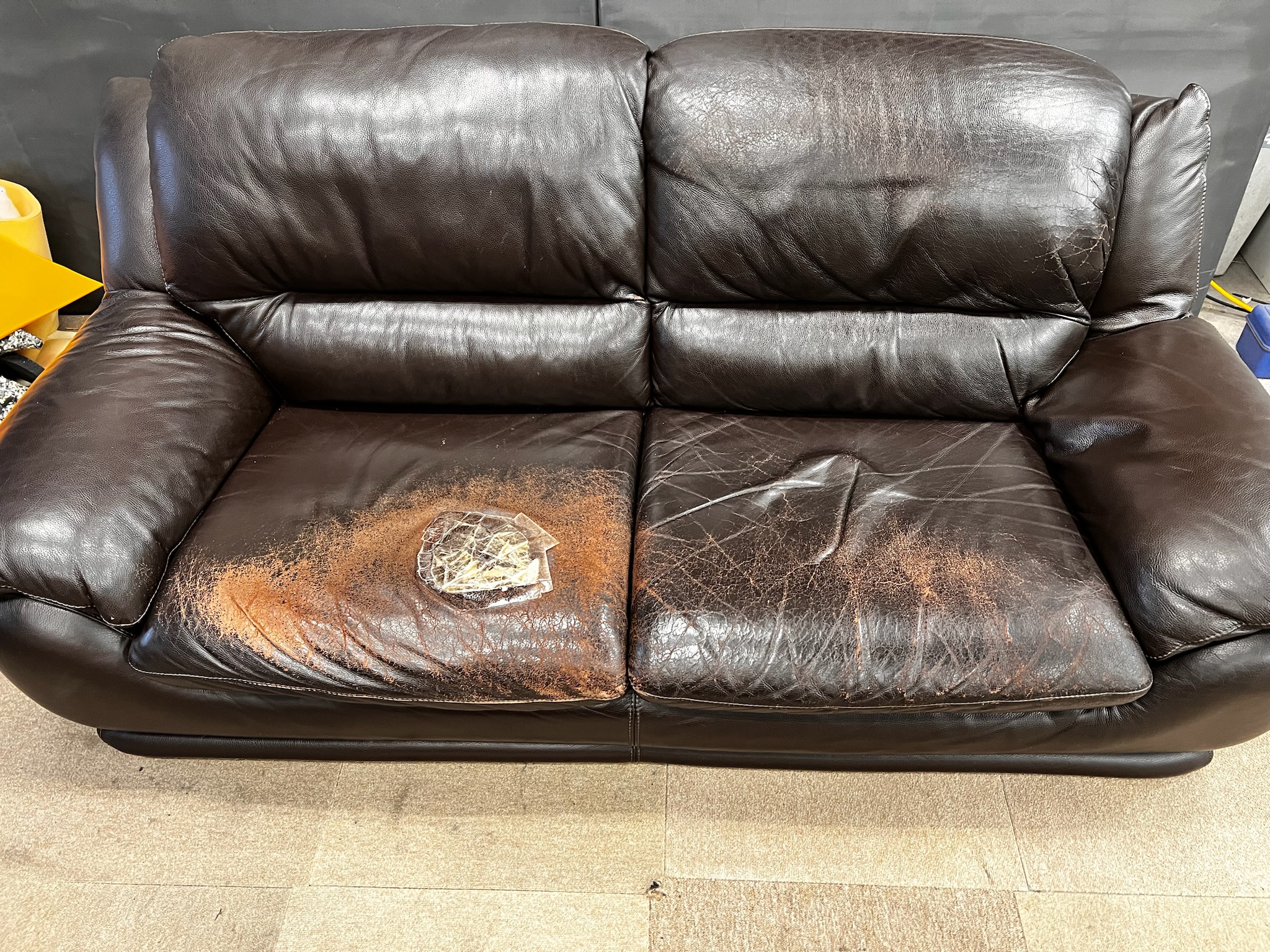 本革のソファの座面張替のご依頼をいただきました。座面の破れ、亀裂が多く入ってしまっており、革の張替えを行いました。 ソファの張替え補修は、部分的に張替え可能です。破れ部分、擦れや深いキズ部分が...
