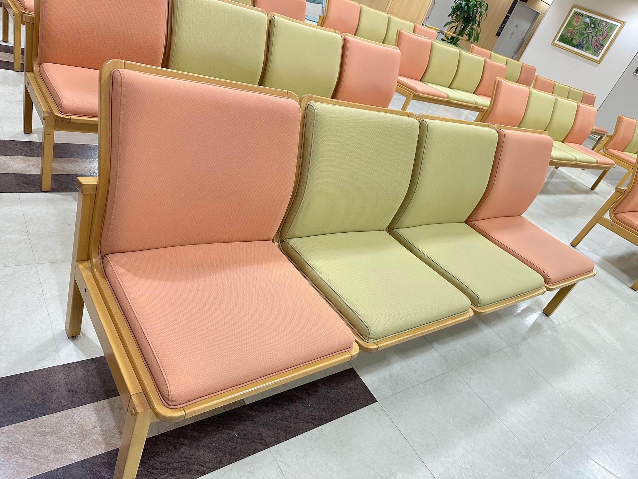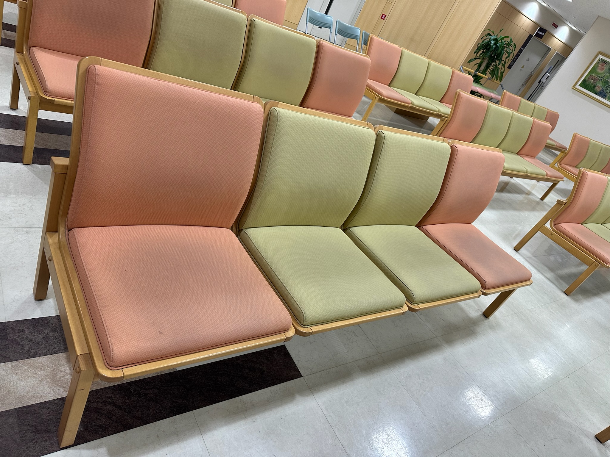 病院の待合ベンチの張替え依頼をいただきました。生地の劣化によるひび割れがあり、生地の張替えをいたしました。張替えをキッカケに生地のカラーもチェンジ。明るい印象の待合になりました♪ 待合い椅子は...