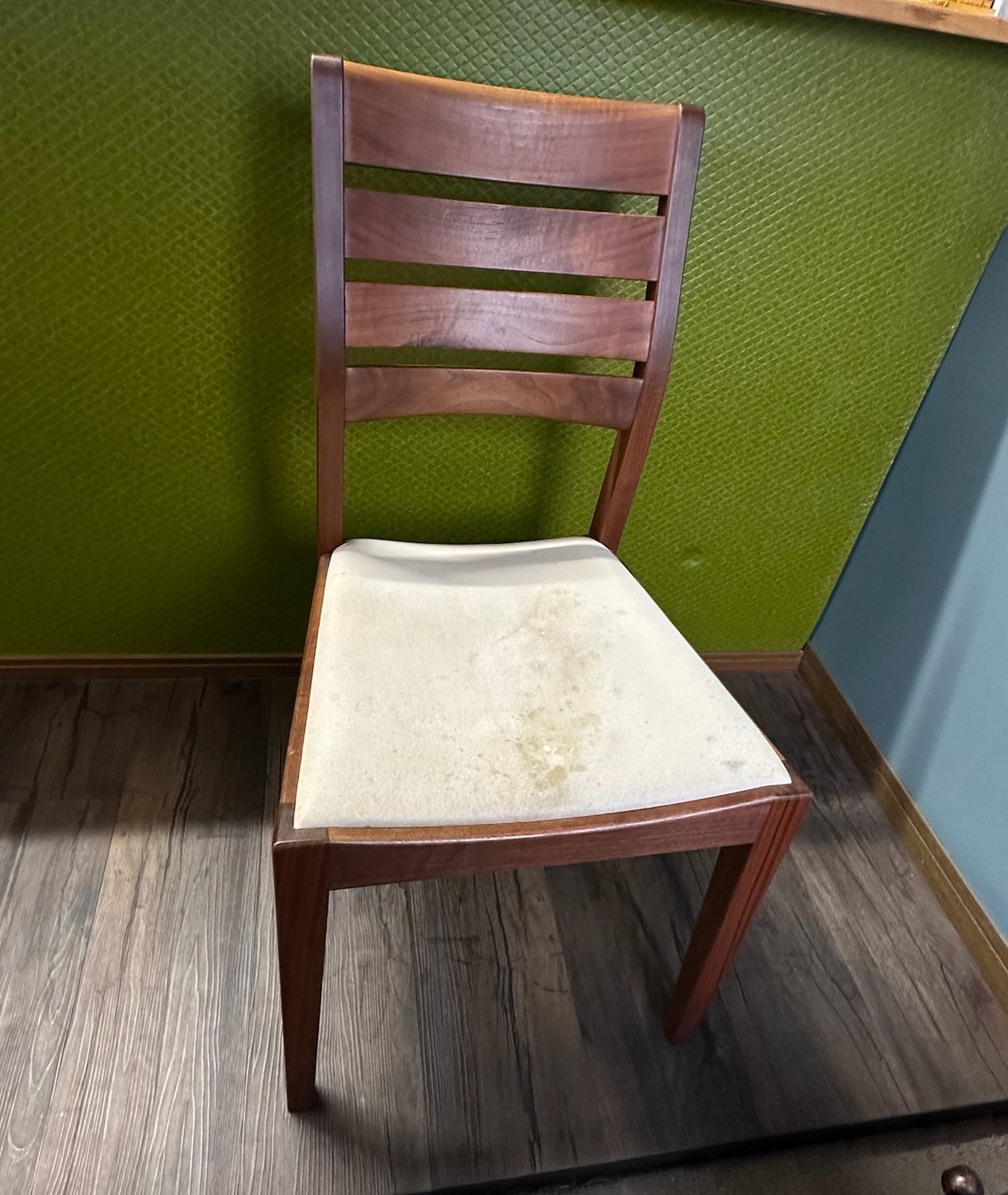 ダイニングチェアの張り替え依頼を頂きました。生地は布製でシミ汚れがある状況でした。ダイニングで使用する椅子は、汚れやすいことも多くご相談が多いです。お気に入りの柄や生地でない場合は、お手入れしや...