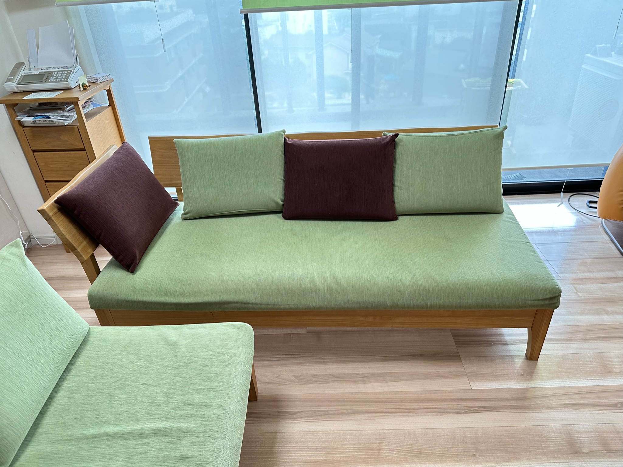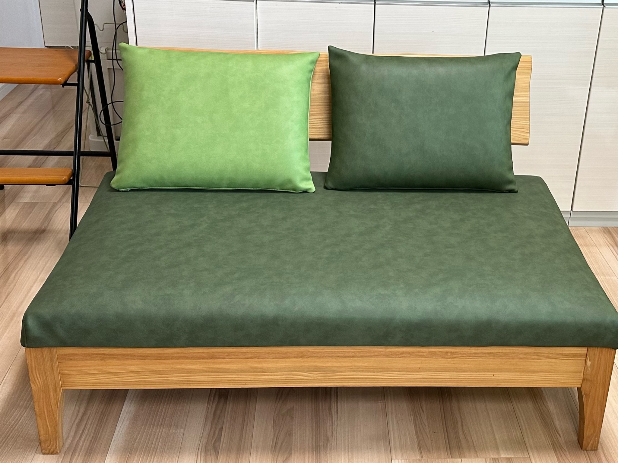 カバータイプのソファの生地交換を行いました。 クッションもソファも、布⇒合皮に☆ カバーのみを取り外しができましたので、製作後現地交換いたしました。 合皮になることでお手入れがしやすいです♪