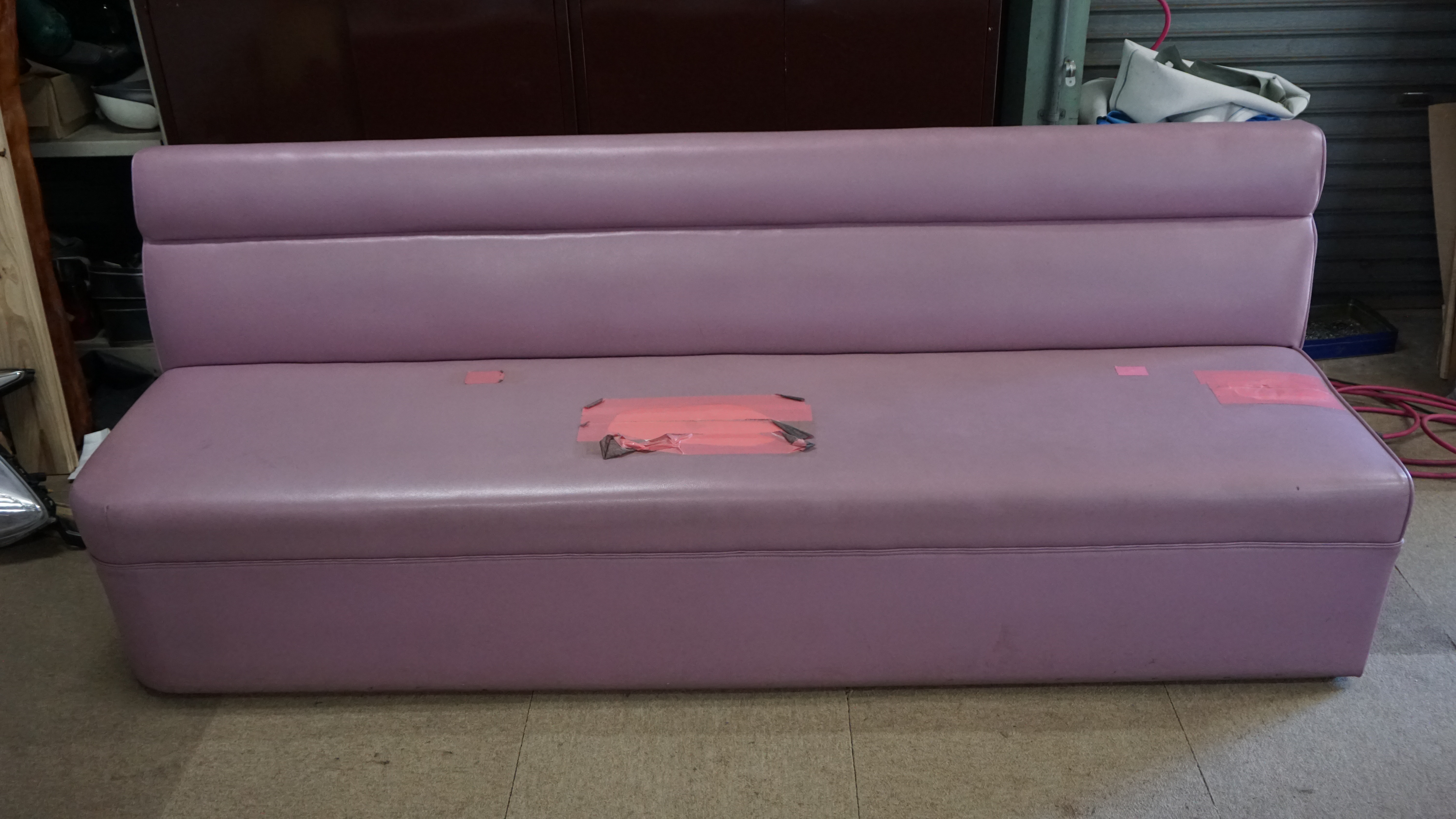 三人掛けボックスソファの座面の張替えを行いました。 一部に亀裂(破れ)があり、座面のみ同色の生地で張替えを行いました。 このタイプは病院待合室、飲食店などで見かけるタイプです。 多くの...