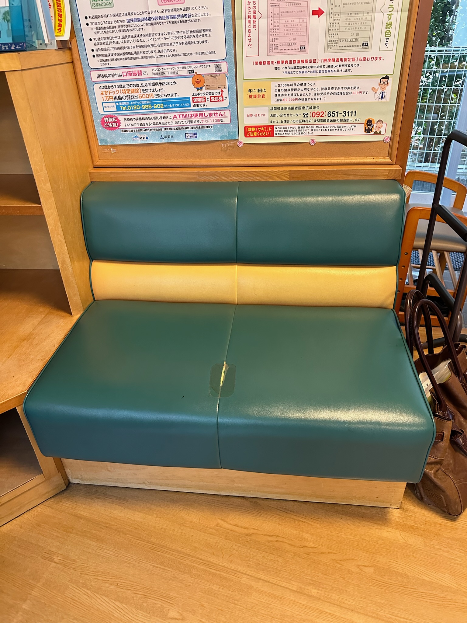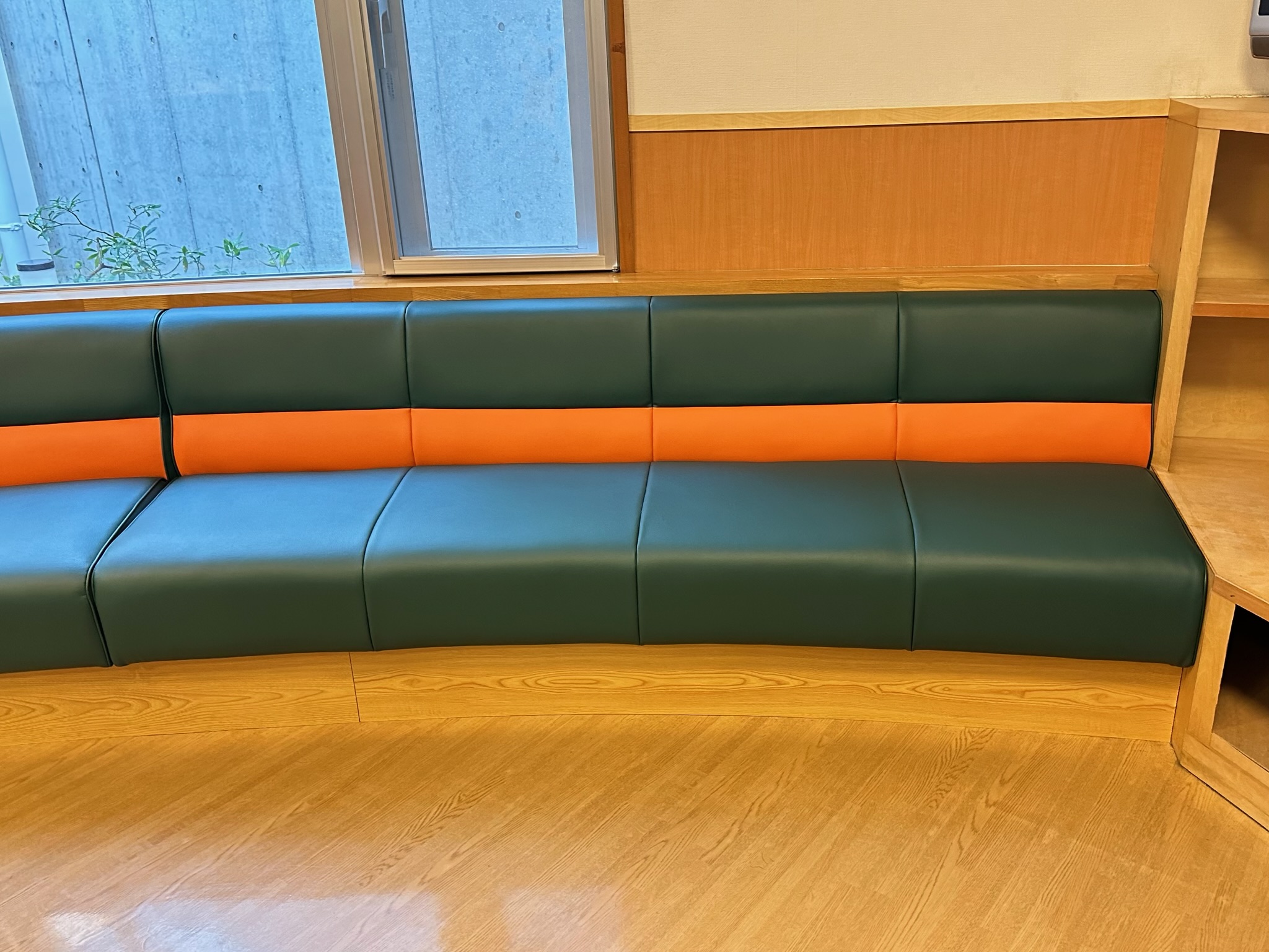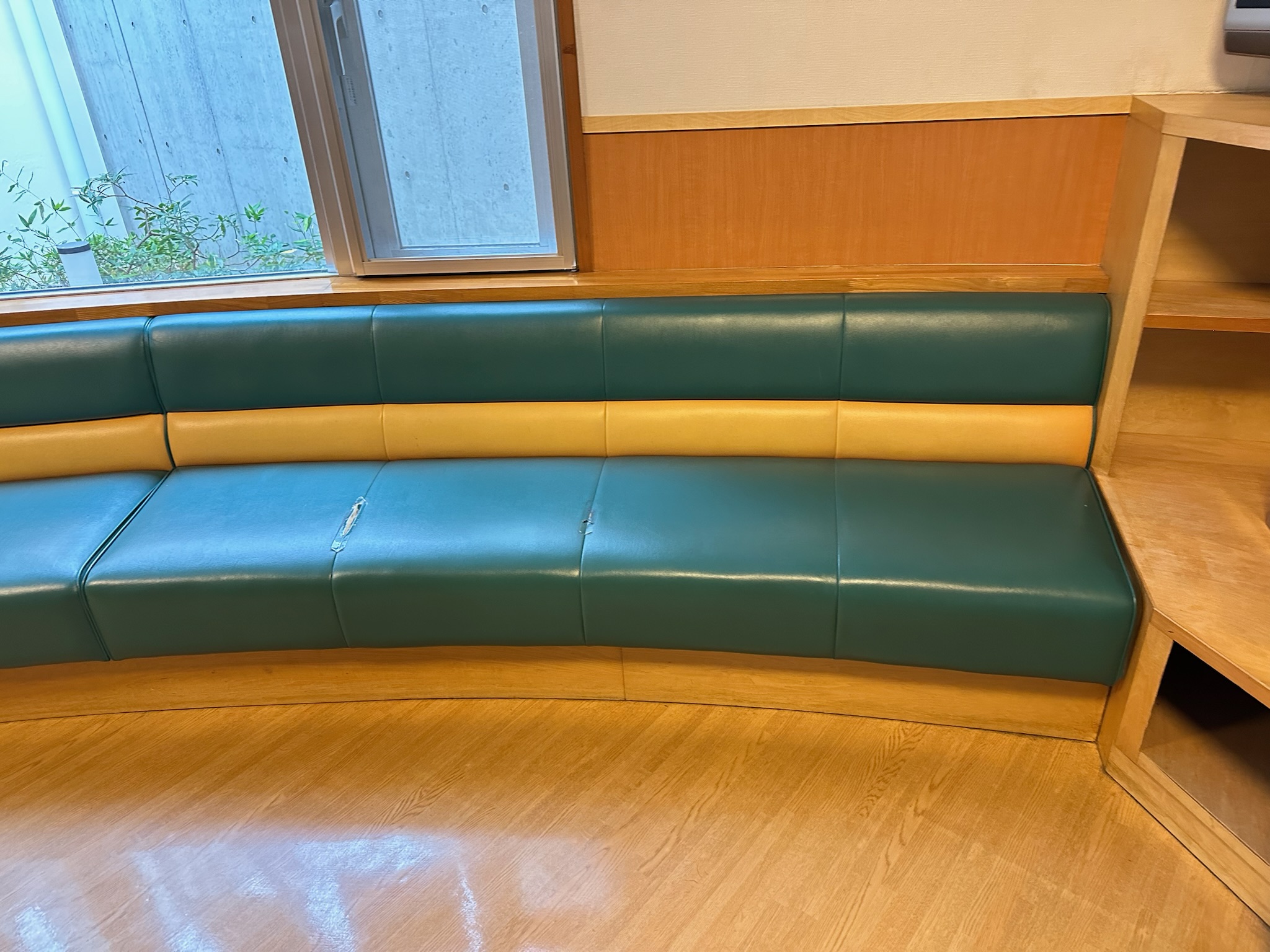 病院の待合ロビーにあるボックスソファの張替えを行いました。 開業からの作り付けの家具でしたので、日焼けや破れ等の劣化のため、背も座も張替えを行っています。
