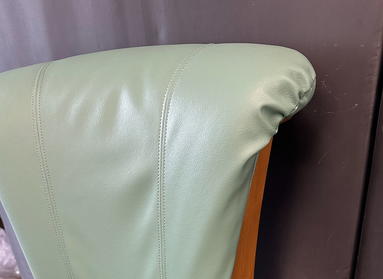ダイニングチェアの背の張替えを行いました。革の劣化が見られ、同色の合皮で部分張替えを行いました。革の状態によりますが、そのまま使える生地はそのままに、縫製の切り替えのあるパーツで部分的な張替えも可能です。 ただ、同年での使用で生地自体も弱くなっていることもありますので、そのあたりも含めご検討いただけるようにご提案させていただきます。本革の製品については、細かい傷くらいであれば染め直しで対応しております☺