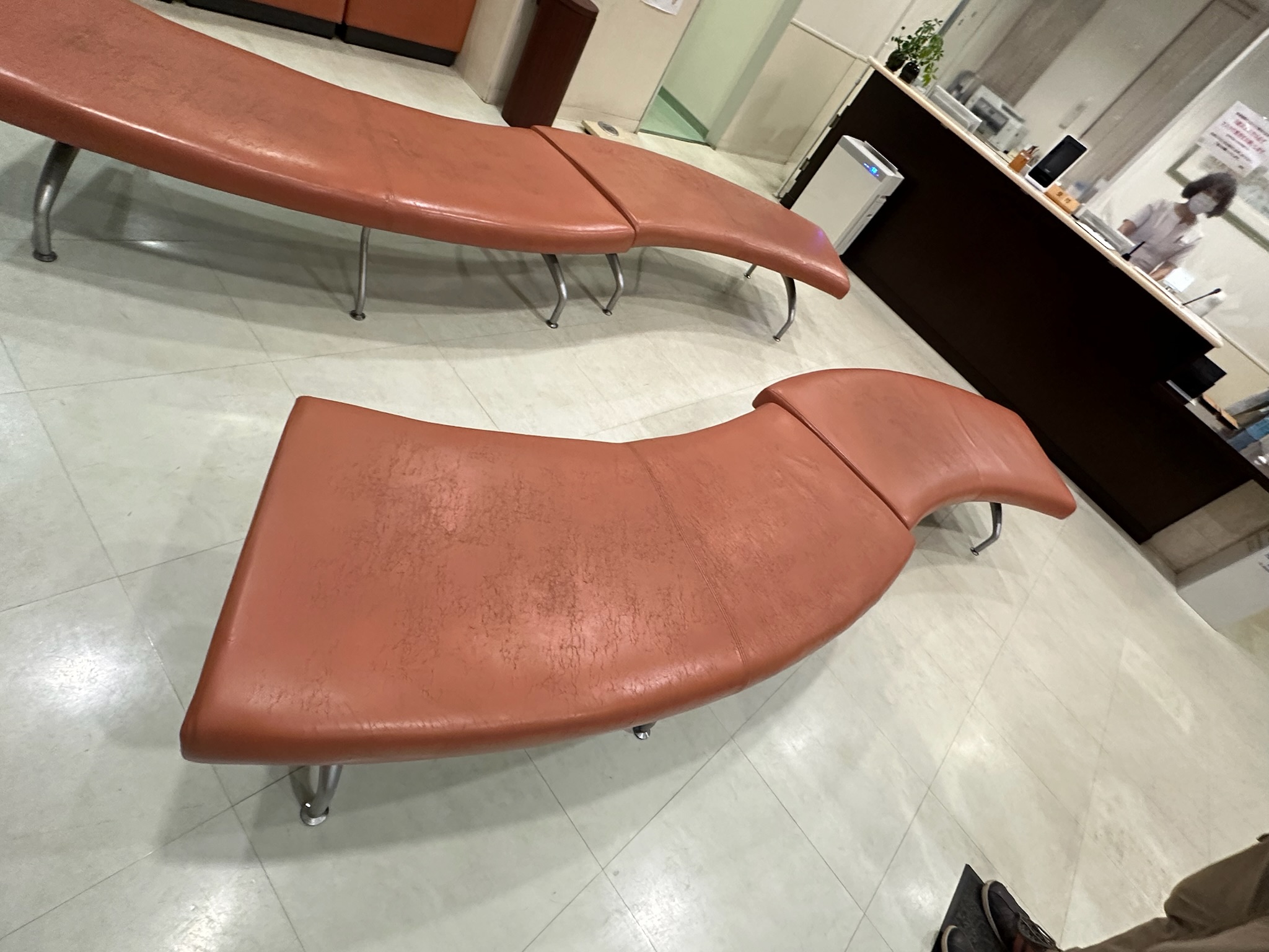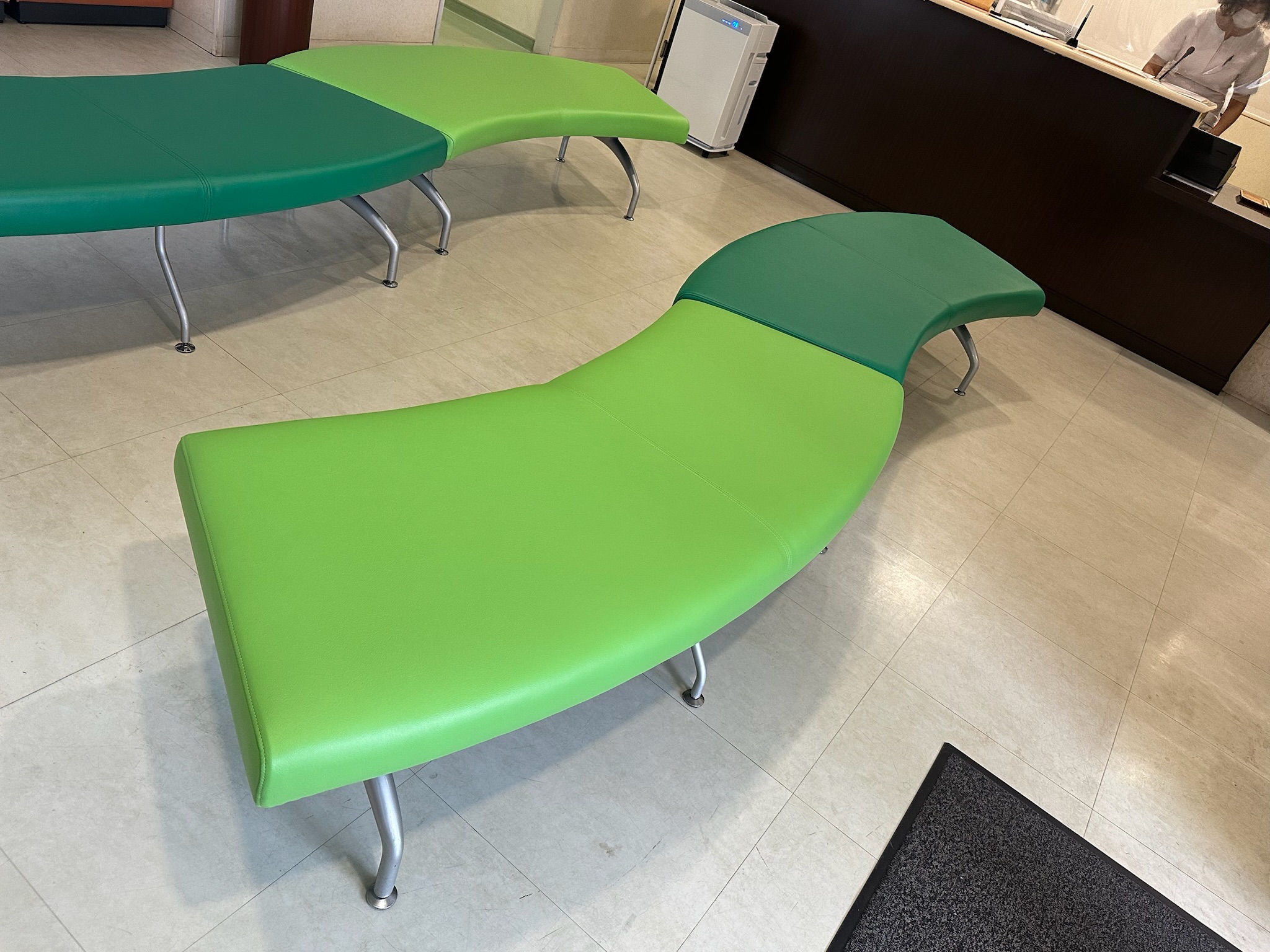 待合椅子 待合ベンチ 病院の待合椅子 ベンチタイプ 生地の張替え 合皮劣化 ひび割れ カラーチェンジ 椅子の張替え